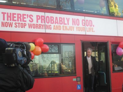 Some 100 buses in London are carrying this ad now for some time. Christian activists tried to stop these ads "reasoning" "Advertisements are not allowed to mislead consumers". Luckily the British surveillance agency has not accepted the complain.